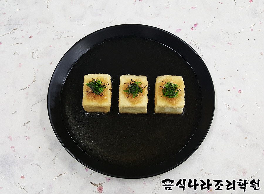 6. 우동면은 뜨거운 물에 살짝 데워 물기를 제거하고 간장소스를 넣고 자작하게 졸여지면 참기름으로 마무리하여 접시에 담고 뜨거울 때 가쓰오부시를 뿌려 담아낸다.